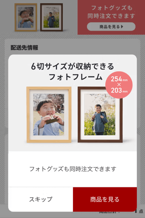 アプリでは、プリントする写真の選択した後に表示される「配送方法選択」のページで同時注文ができます。「商品を見る」の中から「写真台紙」を選択ください。